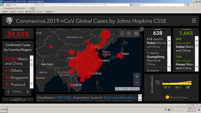 [바이러스] 맵 - (중국 우한 폐렴 바이러스 분포 세계지도) Coronavirus 2019-nCoV Global Cases by Johns Hopkins CSSE